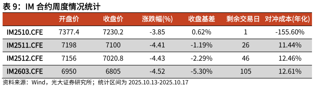 本周IF当月合约下跌1.64%,收于4539.6,收盘基差0.56%;IH当月合约上涨0.30%,收于2983,收盘基差0.51%;IC当月合约下跌4.41%,收于7064,收盘基差0.68%;IM当月合约下跌3.85%,收于7230.2,收盘基差0.62%。