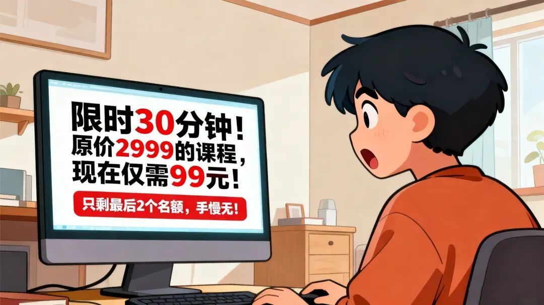 “限时30分钟!原价2999的课程,现在仅需99元!”“只剩最后2个名额,手慢无!”