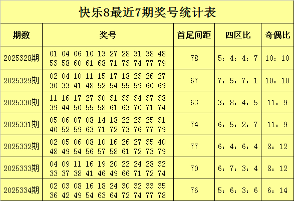 福彩快乐8第2025334期开出奖号:02 03 08 16 18 24 30 32 33 35 36 42 49 54 63 64 72 74 77 78,其中奖奇偶比6:14,四区比为5:6:3:6,跨度为:76。