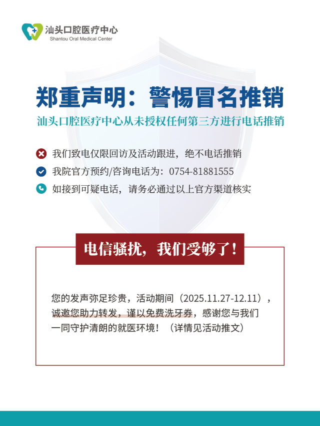 去年以来,我院持续收到关于“以汕头口腔医疗中心名义进行电话推销”的反馈。这些来路不明的电话,不仅带来了困扰,更深层地,它们动摇了医患之间赖以生存的信任基石。不少市民疑惑:那些人为什么会有他们的电话?