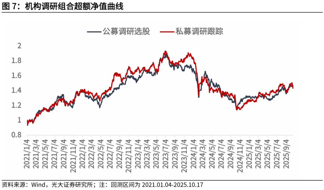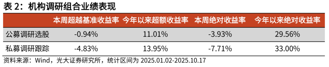 本周公募调研选股策略和私募调研跟踪策略获取负超额收益。公募调研选股策略相对中证800获得超额收益-0.94%,私募调研跟踪策略相对中证800获得超额收益-4.83%。