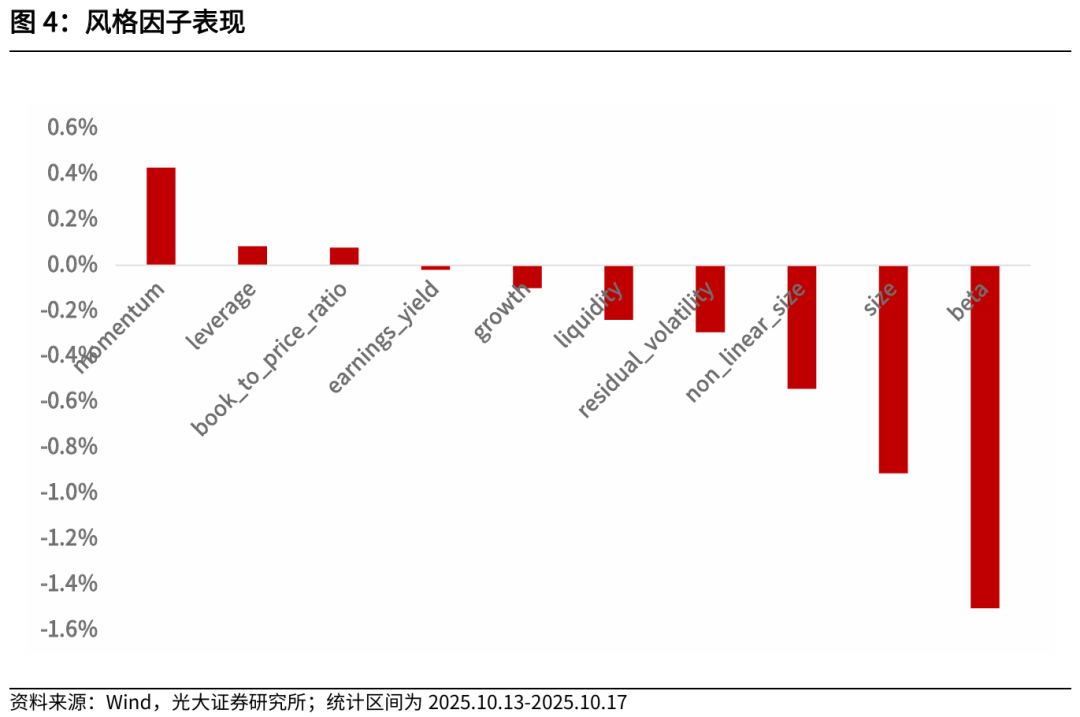 大类因子表现来看,本周全市场股票池中,动量因子获取正收益0.43%,市场表现为动量效应;Beta因子、市值因子、非线性市值因子分别获取负收益-1.50%、-0.91%、-0.54%;市场表现为小市值风格;其余风格因子表现一般。