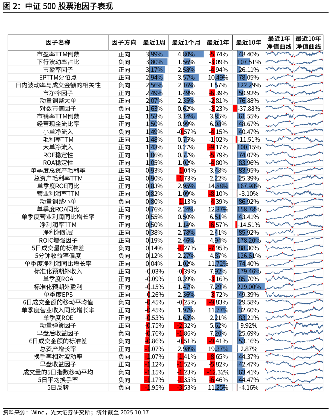 中证500股票池中,本周表现较好的因子有市盈率TTM倒数(3.99%)、下行波动率占比(3.80%)、市盈率因子 (3.17%)。表现较差的因子有5日反转 (-1.95%)、5日平均换手率(-1.17%)、成交量的5日指数移动平均(-1.15%)。