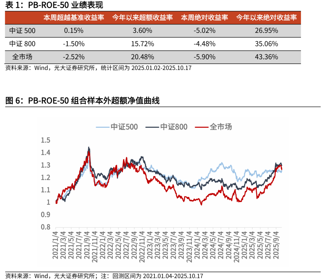 本周PB-ROE-50组合在中证500股票池中获取正超额收益。中证500股票池中获得超额收益0.15%,中证800股票池中获得超额收益-1.50%,全市场股票池中获得超额收益-2.52%。