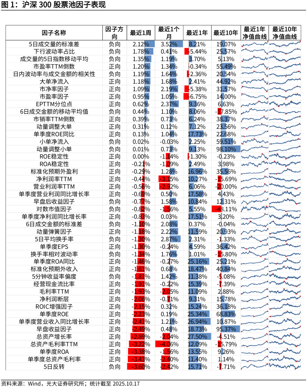 沪深300股票池中,本周表现较好的因子有5日成交量的标准差 (2.12%)、下行波动率占比 (1.78%)、成交量的5日指数移动平均 (1.35%)。表现较差的因子有5日反转(-3.60%)、单季度总资产毛利率(-3.43%)、单季度ROA (-3.38%)。