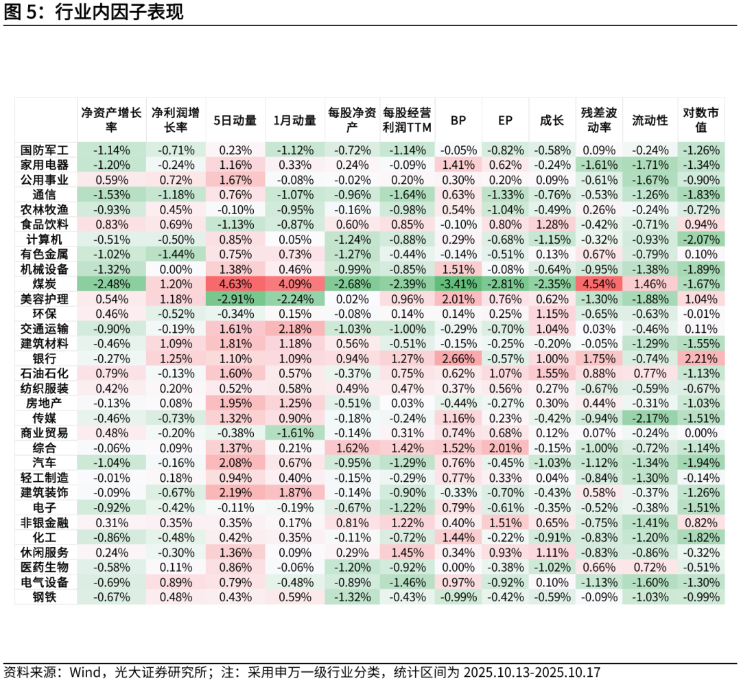 因子行业内表现,本周,基本面因子在各行业表现分化,净资产增长率因子、净利润增长率因子、每股净资产因子、每股经营利润TTM因子在非银金融行业正收益较为一致。估值类因子中, BP因子和EP因子在家用电器、综合、非银金融行业正收益较为一致。残差波动率因子和流动性因子在煤炭行业正收益明显。市值风格上,本周食品饮料、美容护理、银行行业大市值风格显著。