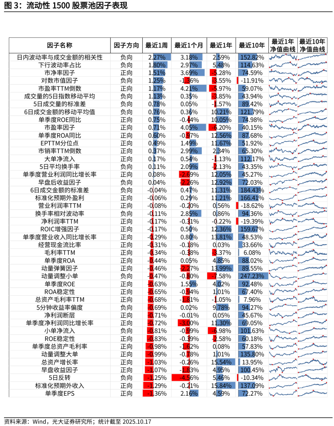 流动性1500股票池中,本周表现较好的因子有日内波动率与成交金额的相关性(2.27%)、下行波动率占比(1.80%)、市净率因子(1.51%)。表现较差的因子有单季度EPS (-1.36%)、标准化预期外收入(-1.29%)、5日反转(-1.25%)。
