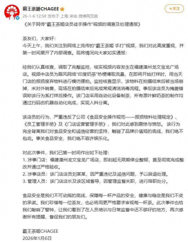 1月6日,霸王茶姬因“店员徒手操作饮品”视频引发网络热议,霸王茶姬当日发布调查通报,宣布辞退涉事店员并对涉事门店作出无限期停业整顿处理。